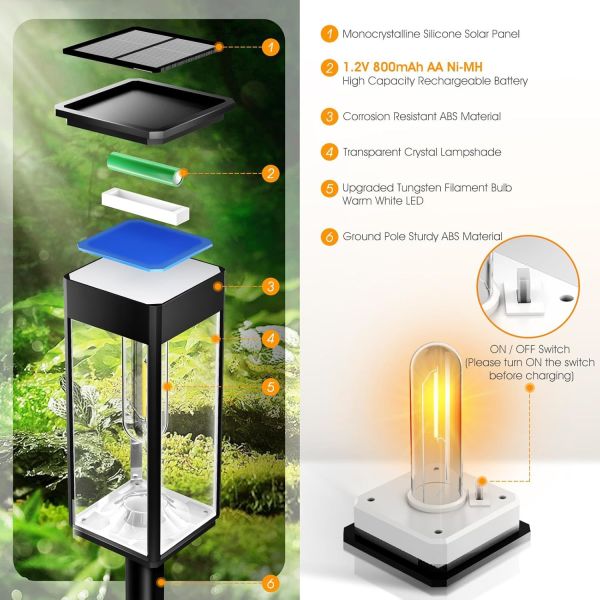 Upgraded solar courtyard light, using high conversion rate monocrystalline silicon solar panels, paired with 800mAh high-capacity nickel hydrogen batteries, can achieve 10-13 hours of long-lasting lighting after charging for 4-8 hours. Built in retro tungsten filament light bulb, with soft and bright light, suitable for outdoor scenes such as courtyards, trails, lawns, steps, etc. IP65 waterproof rating, strong weather resistance, working in a wide temperature range of -25 ° F to 150 ° F, worry free all year round. No wiring required, easy installation, supports three levels of height adjustment, meets diverse lighting needs.